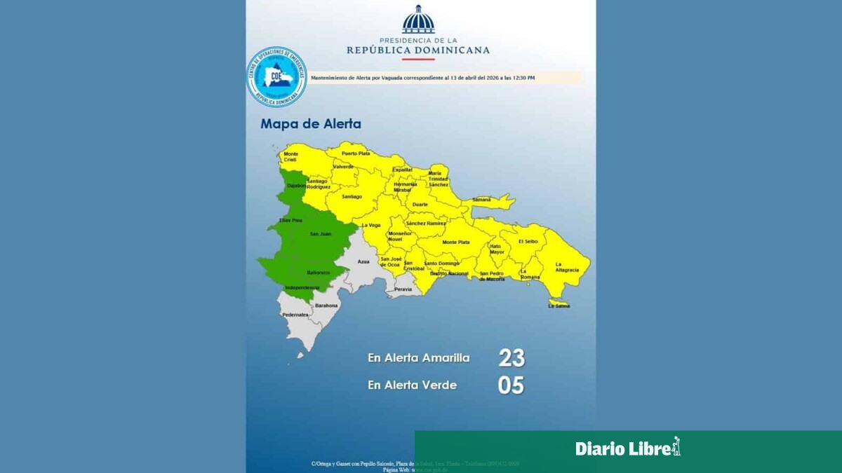 El Centro de Operaciones de Emergencias (COE) informó este lunes que mantiene 23 provincias en alerta amarilla y cinco en alerta verde debido a la incidencia de una vaguada que continúa generando condiciones de inestabilidad en el país.