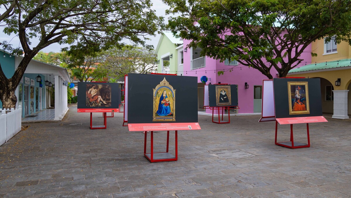 El montaje en Punta Cana también tiene su propio carácter. La exposición se despliega en la explanada del Centro Cultural Rainieri y se extiende hacia la Capilla Nuestra Señora de Punta Cana, siguiendo el recorrido peatonal que conecta con Galerías Puntacana, en el Village.